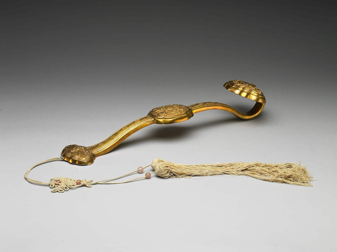 “金如意”首部中央饰寿星,周围环绕鹿、鹤、蝙蝠及祥云,象征福、禄、寿。柄中央饰五蝠捧寿,周围饰“圣寿无疆”楷书;趾部饰寿山福海纹,而柄面列饰长“寿”字。背面趾部背贴黄绢籤“子皇帝臣溥仪跪进”,可知此为宣统皇帝庆贺隆裕皇太后圣诞所递的如意。