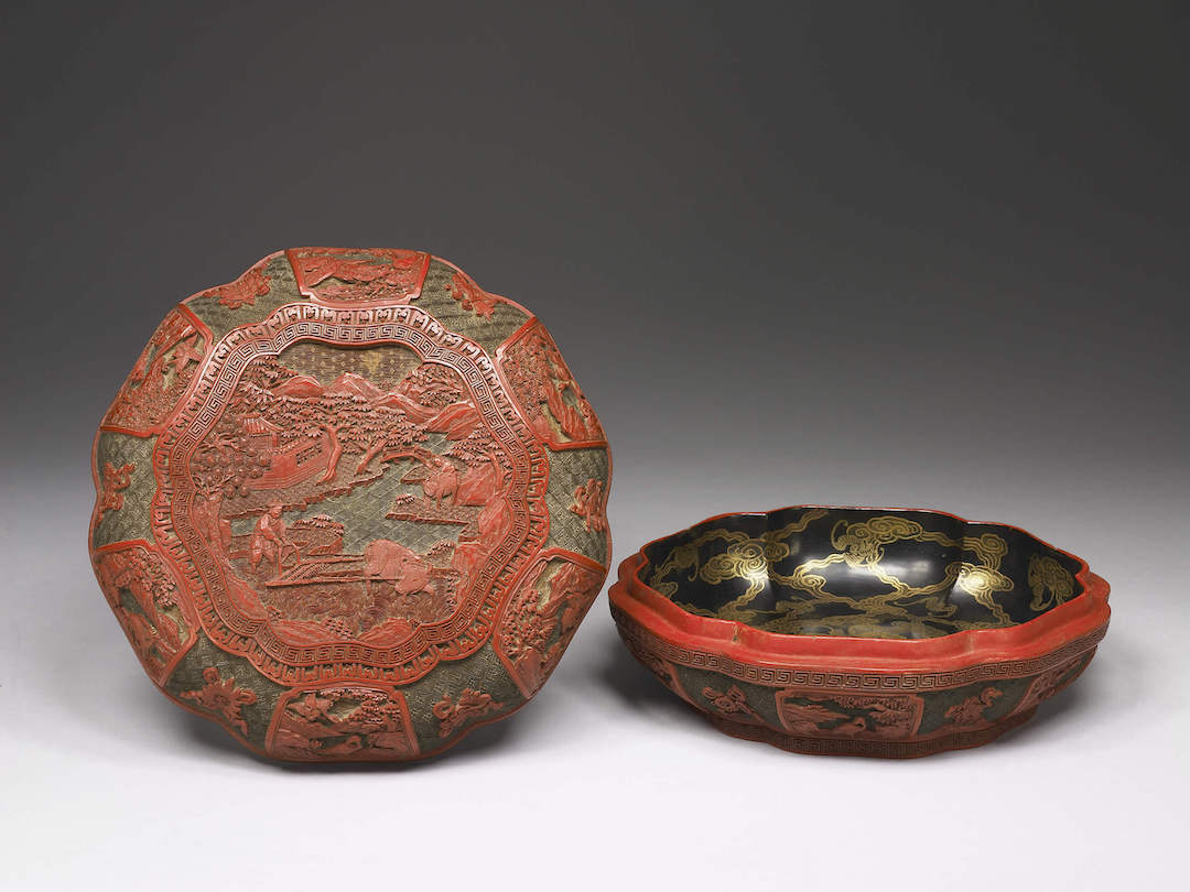 此“六瓣式剔彩漆盒”盖面刻划耕作图,农夫双手握着“碌碡”与前方回望的水牛一同整平水田。整体构图参考自清康熙朝以降,宫廷画家焦秉贞(活动于17世纪晚期至18世纪早期)与冷枚(约1669-1742)所绘的《耕织图册》。全作剔去不同色漆表现图样:上层以朱漆表现主要的人物、水田与山林等,中层绿漆贯穿为河面,再底层黄地则为远景天空。