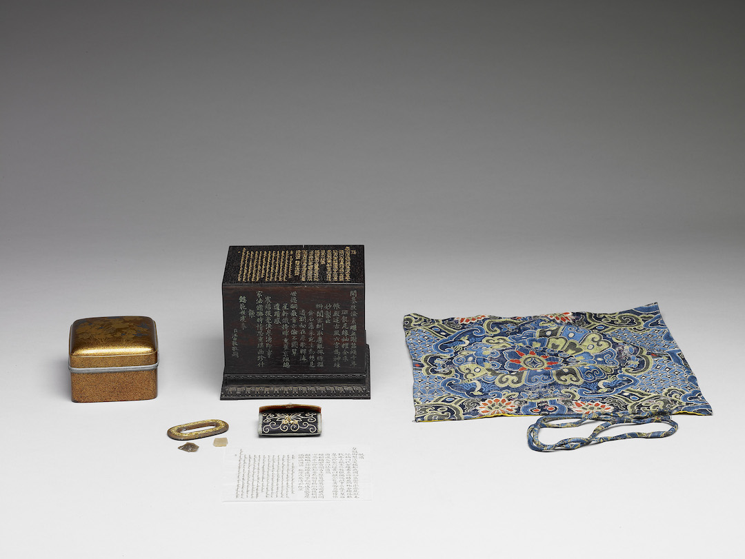 清 乾隆 孝贤纯皇后绣花卉火镰荷包 附火镰、火石、漆盒、锦袱、高宗墨书汉满文一纸、紫檀木盒