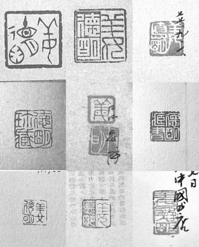 笔者收集姜德明钤盖于不同时期图书上的印章,目前确认的共有九枚,分别是:1.姜德明(大篆宽边朱文),2.德明珍藏(朱文),3.姜德明(朱文),4.姜德明(朱白相间),5.姜(大篆朱文)、德明(大篆白文),6.姜德明(朱白相间),7.姜德明(白文),8.德明藏书(白文),9.姜德明(竖式,朱文)。印章整体质量较好,以入印文字来看,从甲骨文、金文到小篆都有,且都是小印,像第—、第二、第五、第七枚称得上精美。姜德明长期在《人民日报》副刊部执编“大地”副刊,有机会接触到国内第一流文艺家,其中不少就以多艺多才著称,还精于篆刻,如钱君匋、李白风、曹辛之等。姜德明的藏书章中,可能就有出自于他们之手的印章。另外,笔者还注意到姜德明在使用这些姓名章时,钤盖位置、印章大小、印泥大体还讲究。不过,笔者也发现有些印章可能出于后人的追加,如钤盖在书尾的姓名章,与钤盖于书扉页的印章重复,前人只有在书末写题跋时才加盖印章。而扉页目录页或正文的反复钤印也显得叠床架屋。钤印既是藏书家曾经收藏的纪录,也接续了藏书文化中的优秀传统,朱砂红印钤盖在经过时间风化略略泛黄的纸上,增饰了书籍被”读过”的美感,也显示了藏书家的珍惜之心。
