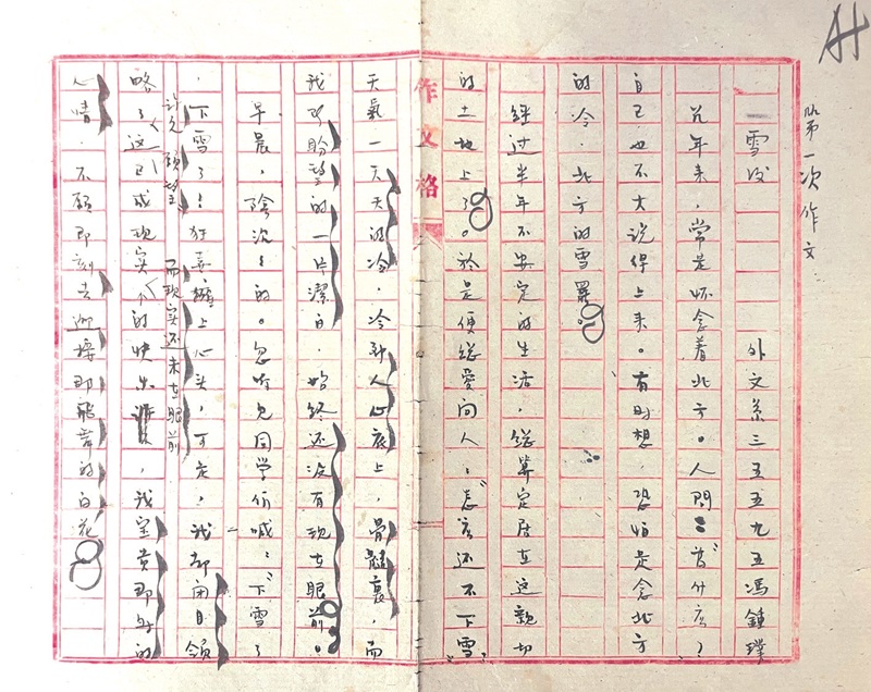 在《雪后》手稿首页的最右侧,竖行题写着五个字:“第一次作文”。想来是作文发下来后,宗璞先生在上面写的吧?