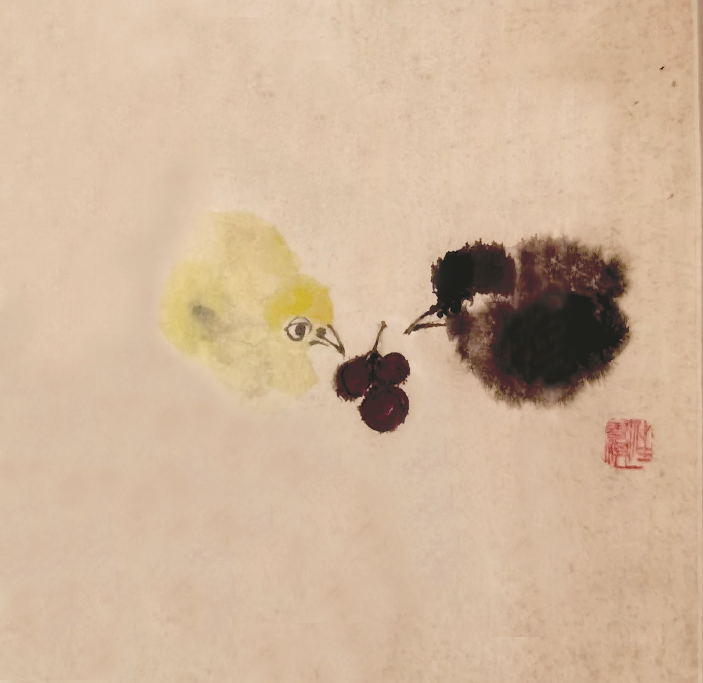 那是宗璞先生第一次向汪曾祺先生讨画:“不想一周内便来了一幅斗方。两只小鸡,毛茸茸的,歪着头看一串紫红色的果子,很可爱。果子似乎很酸,所以小鸡在琢磨罢。”(《三幅图》)随后,汪曾祺先生又给宗璞先生画了一幅牡丹图并题诗:“人间存一角,聊放侧枝花,临风亦自得,不共赤城霞。”此外,还有一幅水仙图和一幅写意荷花图。