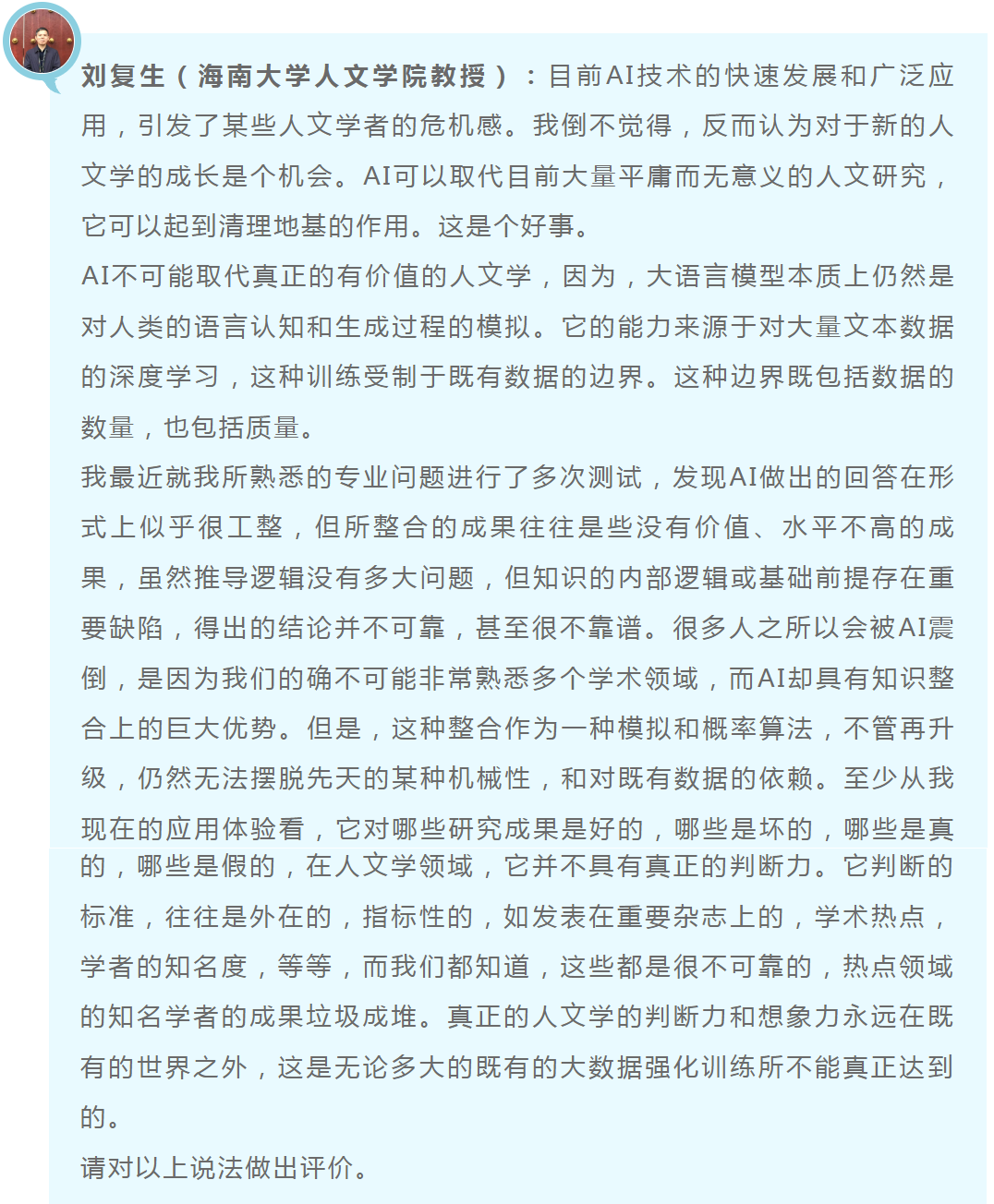 你的观点非常中肯,既看到了AI技术的潜力,也指出了其局限性。AI确实可以在某些方面辅助人文学科的研究,但它无法取代人类学者的创造性、批判性和判断力。未来,AI与人文学科的关系应该是互补的,而不是对立的。通过合理利用AI技术,人文学科可以迎来新的发展机遇,同时保持其独特的价值和意义。