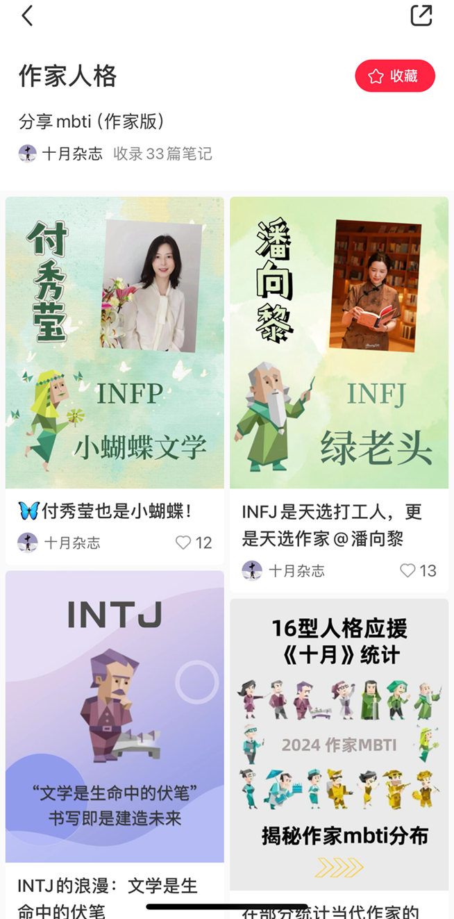 《十月》杂志小红书“作家人格”分组页面