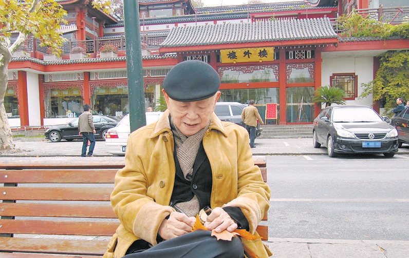 到楼外楼时,太阳还未下山,大家不着急用餐,坐在楼外楼门口面朝西湖的长椅上,一边赏秋,一边说话。黄先生捡起一片刚从梧桐树上飘下来的叶子,拂去灰尘,从口袋里掏出笔,在上面写了首诗,送给同行的朋友。