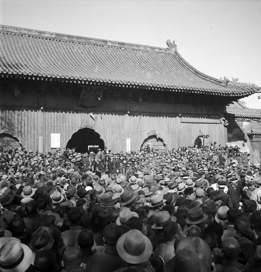 正月,雍和宫天王殿前,喇嘛正在跳布扎,围观者人山人海。