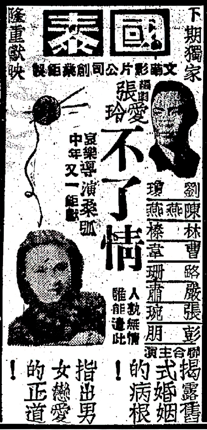 紧接着,情感的拉丝更细更密也更长的《不了情》在国泰戏院登场。电影海报上有对“健康的主题”宣告:“揭露旧式婚姻的病根!指出男女恋爱的正道!”(电影《不了情》广告,香港《大公报》1951年5月21日);也有以导演之名趁热打铁的召集:“《哀乐中年》导演桑弧又一巨献”“本院连满一百一十场之《哀乐中年》大导演”(电影《不了情》广告,香港《大公报》1951年5月24日);不过,比导演名更居视觉中心、字体也更大的是编剧“张爱玲”。此时的张爱玲,还在解放后的上海:她以笔名“梁京”在《亦报》上连载了长篇小说《十八春》,桑弧期待这是她“创作生活上的再出发”(叔红[桑弧]:《推荐梁京的小说》,上海《亦报》1950年3月24日),她也以这个笔名为桑弧导演的新片《太平春》写了影评;她还在夏衍的关注下,参加了“上海市第一届文学艺术工作者代表大会”。因为《不了情》,她的名字出现在香港海报和报纸上的时候,《十八春》已在报上连载完,她可能为单行本的出版忙着修订,也可能已经在着手写中篇小说《小艾》,几个月后它又将在《亦报》上连载。