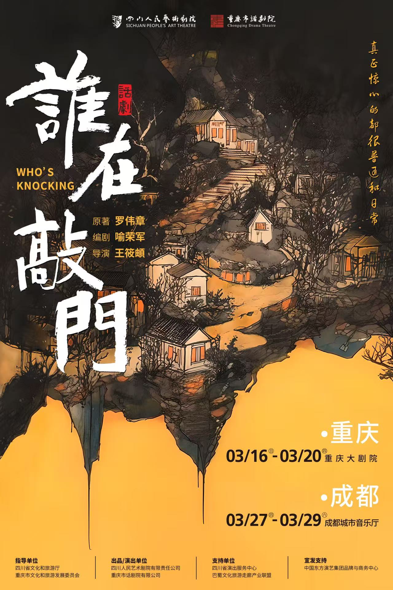 话剧《谁在敲门》由四川省演出服务中心、巴蜀文化旅游走廊产业联盟支持,中国东方演艺集团品牌与商务中心宣发支持。据悉,该剧重庆站演出将持续至3月20日,此后还将于3月27日至29日登陆成都城市音乐厅。