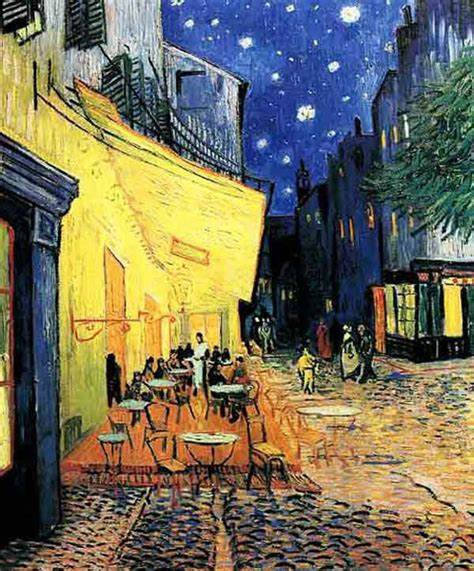 “夜晚的色彩比白天更加生动、更加丰富”。在表现《夜间的露天咖啡座》时,梵高使得咖啡厅明亮的黄色与蓝色形成了鲜明的对比。尽管画的是夜晚,但没有一丝黑暗,天空是浓郁的蓝色,远处的房屋是深蓝色,近处的咖啡馆墙面是黄色,露天平台是橙色,地面则是黄橙色向蓝色的过渡。这种鲜艳的色彩和视觉上的强烈对比是阿尔勒赋予梵高的。梵高的早期作品受荷兰传统绘画(如伦勃朗)和现实主义画派影响,色调以灰暗、深沉为主,常用棕色、黑色和暗绿色,整体氛围压抑。如在《吃土豆的人》(1885年)中,画面以深褐色调为主,仅通过微弱的光线突出人物的质朴与贫困。