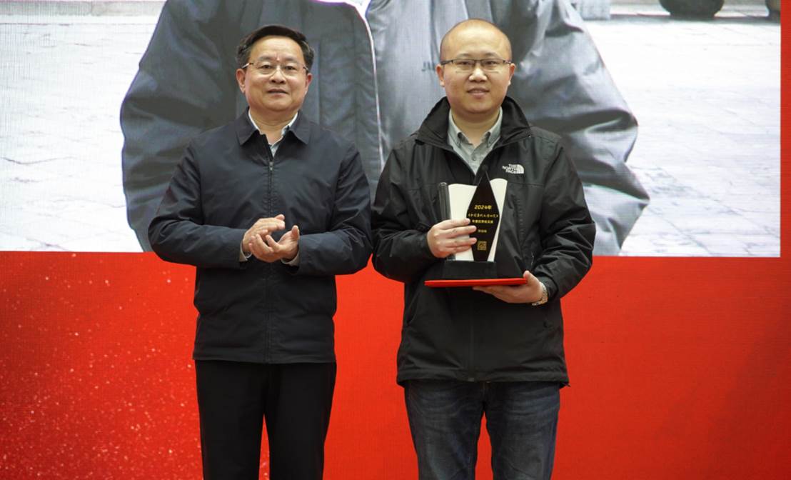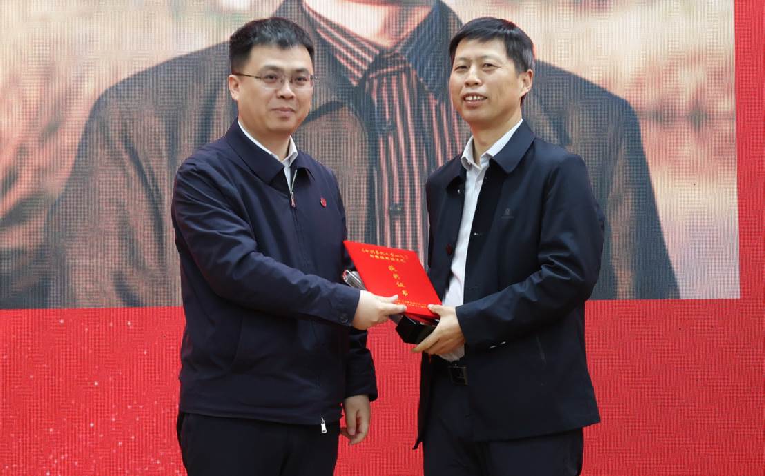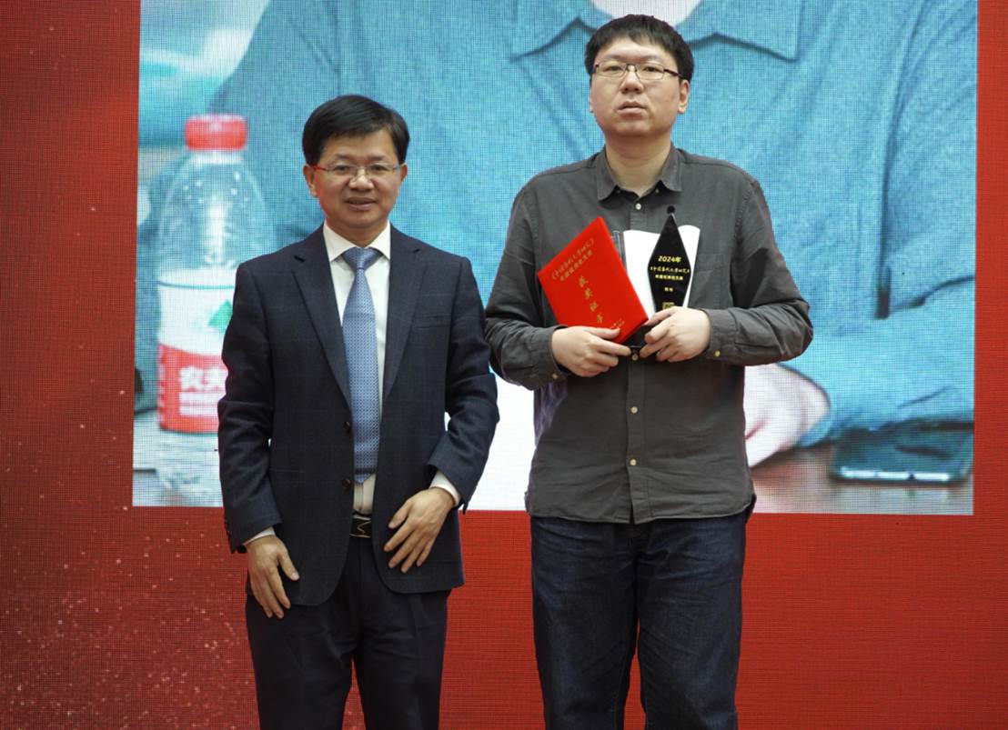 山东出版集团党委书记、董事长刘文强为贺桂梅颁奖(山东大学文学院研究员尹林代领)