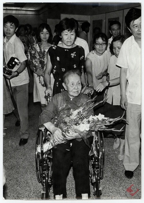 冰心在“冰心文学创作生涯70年展览”现场
