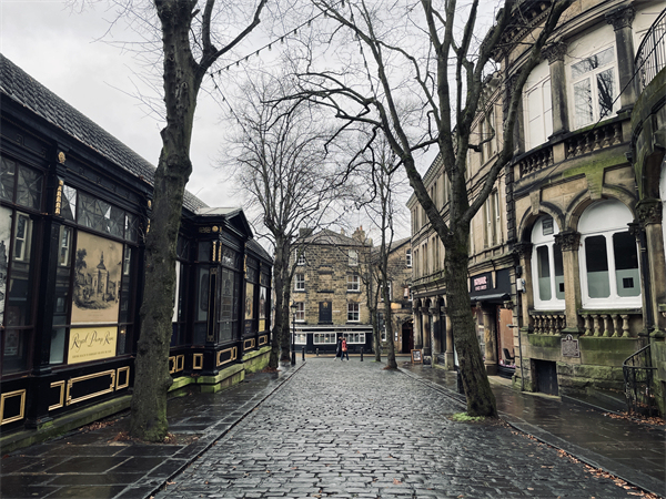 往哈罗盖特去的火车上,窗外风景逐渐从城市转为典型的英格兰乡村景观,间或点缀着林地,虽已上午10点多,但冬日的晨雾还未散尽,阳光射下来,显得颇有仙气。哈罗盖特给人的第一印象相当好,街道是整齐的维多利亚时期建筑,没有碍眼的新楼房,这里曾经连续三年被选为英国“最乐居城市”。自16世纪此地发现温泉以来,这里就成了全英国闻名的疗养地,富人们拖着病体接踵而至,也让城市财富得以积累。一圈走下来感觉这里明显是流淌着“老钱”的地方,当地人似乎对自己的城市历史非常自豪,几乎每走几步就会看到建筑物上挂着铭记历史的“蓝牌”——不过这儿统一用的是棕色底。