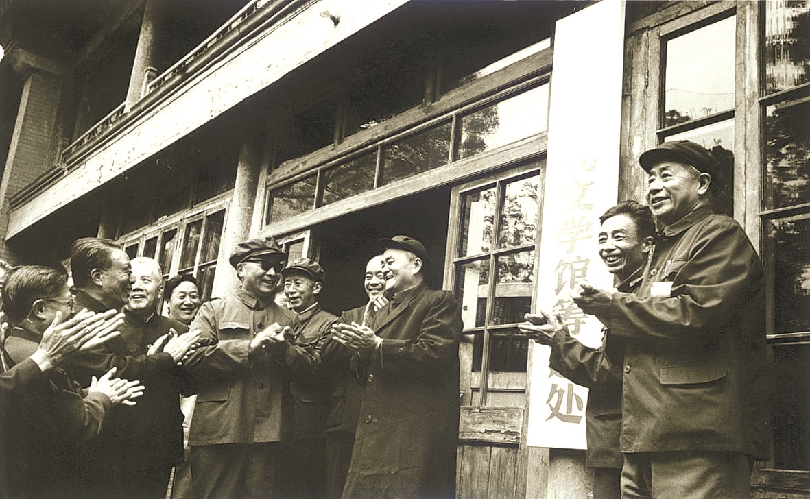 1985年3月26日,这对巴金(左二)来说是个难忘的日子,梦寐以求的中国现代文学馆终于正式开馆了。由叶圣陶手书的长匾“中国现代文学馆”挂在京城西郊万寿寺古朴庭院的门口。巴金露出了欣慰的笑容。