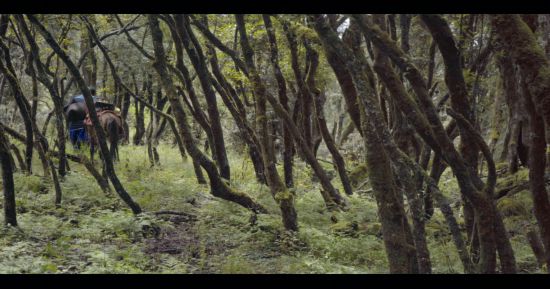胡豆作为本场戏的主演,身着传统服饰,缠上脚带,尽管在摄影机当中,缠脚已经被裤脚所掩盖,看不出来,但演员还是很细致地缠上了每一只脚,开拍之后,就牵着马从丛林深处走来。
