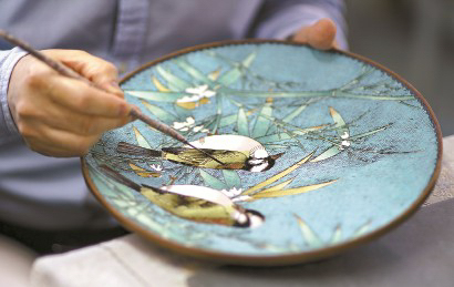 技师在为景泰蓝工艺品进行“点蓝”。 新华社 发