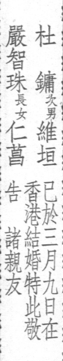 按照杜月笙幼子杜维善的口述,杜家儿女的婚事基本由杜月笙决定,杜维垣很听父亲的话,他也生于1921年,一直在美国读书,抗战胜利后学成回国,杜月笙要他跟严家小姐结婚,他就奉命结了婚。不过杜维善比杜维垣小12岁,自述战后杜维垣回国自己才第一次见到他,他婚后不久又走了,以后一直在美国的联合国文教处工作。可见兄弟间了解极少。杜维善还说过他二嫂、五嫂都是严家仁字辈的,大概是表姐妹或堂姐妹,二嫂结婚后妹妹也嫁到了杜家。这些都明显有误。严智多女儿严仁芸确实比严仁菖小了五岁,但是早一年嫁进杜家。杜维垣一直在美国读书,战后拿到教育硕士学位后回国,1947年1月当选为上海嵩山区区长。抗战胜利后杜月笙曾回到上海,由于身体原因又去了香港养病,2月20日,杜维垣飞去香港。当时上海小报报道了这一消息,认为杜维垣是去向父亲报告近期上海的商务状况。同机去港的还有他当时的未婚妻严仁菖及其父母严智珠夫妇。但其实这次去香港主要是为了办婚礼。3月9日,杜维垣严仁菖结婚。第二天的上海大报上登了杜月笙和严智珠联名宣布的消息: