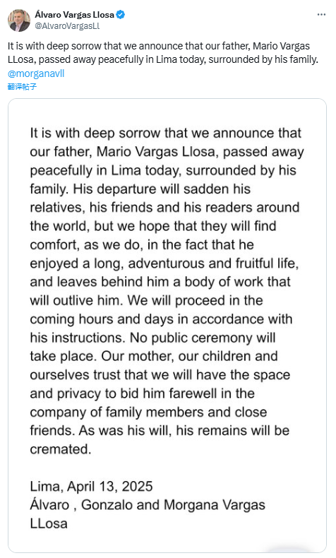 略萨的儿子阿尔瓦罗·巴尔加斯·略萨在社交媒体X上宣布了这个消息