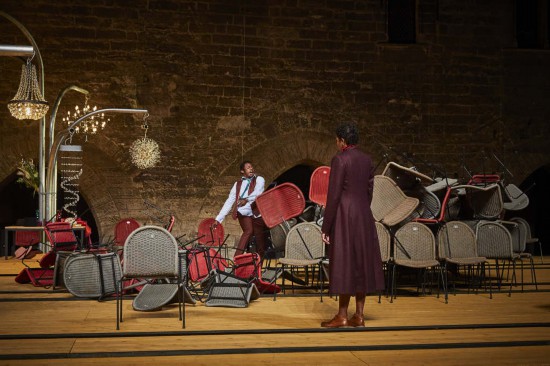 在舞台呈现上,该剧的表现可圈可点,给了观众不少新体验。蒂亚戈打破现实主义手法,选择以极简美学重构经典。舞台是现代化的,这里不像是农牧庄园,更像是火车站,三条横轨上安置着可推动、如樱桃树般的灯树,轨道设计象征着时代的更替,璀璨灯光则代表易逝的旧日荣光。几十把椅子在开场时整齐排列,逐渐被腾挪、叠放......最终清场,展示了旧秩序的崩溃过程。舞台上演员从未真正离开,有时他们在黑暗中静默不动(代表离场),有时则帮助转换场景(推动灯树、搬运椅子),这些设置可能源于最早是在教皇宫光荣庭院、一个露天剧场演出,搬运到室内时不免损失些原有韵味,如不少人提到的习习晚风和演员随风飘动的头发和衣裳,但也还是给了观众一种如梦似幻的感觉。
