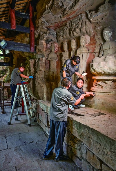 大足石刻研究院保护工程中心的文物修复人员正在进行文物修复。