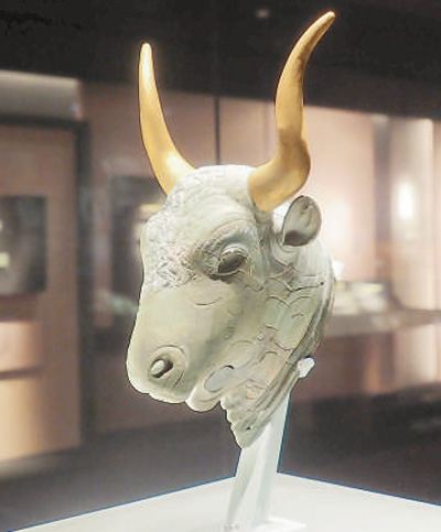 一件距今约3500年的公牛头形绿泥石来通杯引人注目。“来通”一词源于希腊语,意为“流淌”。很多古代文明都把来通杯用作祭酒器,其最大特征是器身上有注液口和出液口。这件公牛头形来通杯注水口位于后颈部和左侧牛角处,出水孔位于牛嘴。牛头面部的毛发刻画细腻,额头处可见螺形发旋。兽头形来通杯是一种珍贵物品,常被克里特岛的统治者作为外交礼物赠送给他国。希腊大陆出土的牛头形来通杯和埃及第十八王朝法老墓壁画上的来通杯图像表明,这种器物在克里特岛与地中海东部其他文明的交往中扮演了重要角色。