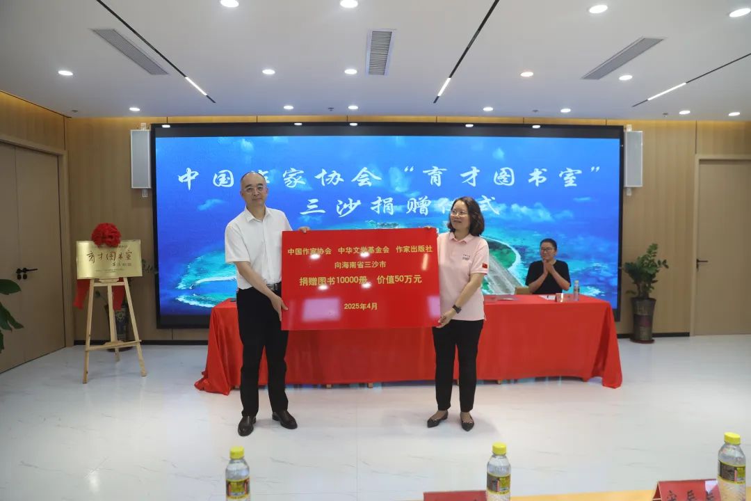 4月23日是第三十个世界读书日,凤凰彩票平台登录入口、中华文学基金会和作家出版社在三沙开展“育才图书馆”捐赠仪式并为“育才图书室”工程项目揭牌。凤凰彩票党组成员、副主席、书记处书记吴义勤,三沙市委副书记、宣传部部长江南参加捐赠仪式。