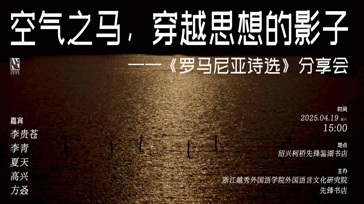 4月19日,由浙江越秀外国语学院外国语言文化研究院和先锋书店联合主办的《罗马尼亚诗选》分享会在绍兴柯桥先锋鉴湖书店成功举办。本次分享会主题为“空气之马,穿越思想的影子”,译者高兴携新书与多位学者、诗人、编辑及青年学子齐聚一堂,通过朗诵、对谈与学术演讲,共同探索罗马尼亚诗歌的文学价值与跨文化传播意义。
