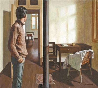 《思想者》左手侧的墙面上,悬挂着袁庆一于1984年创作的布面油画《春天来了》。画面中一位穿着高领毛衣的男青年侧身转头望向窗外,窗外隐约露出春天的嫩绿,写字台上翻开的书本和青苹果,是上世纪70年代末80年代初恢复高考后一代青年奋斗和期待的映射。