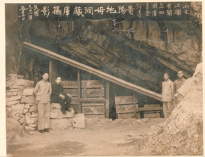 1942年浙江图书馆工作人员与精心保管的文澜阁《四库全书》在贵阳地母洞中合影