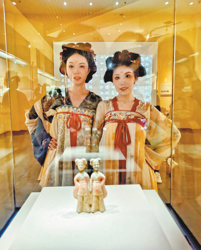 “我俩从陕西西安过来,特地穿了汉服,就是为了和‘姐妹花’合影!”展柜前,游客孙雅身着襦裙,和好友模仿女俑牵手叉腰、顾盼神飞的姿态。