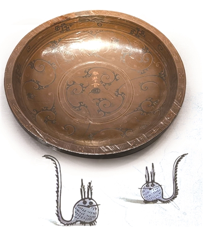 “君幸食”狸猫纹漆食盘与其中的狸猫纹样。
