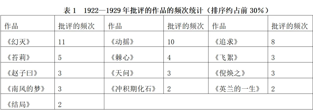 表1 1922—1929年批评的作品的频次统计(排序约占前30%)