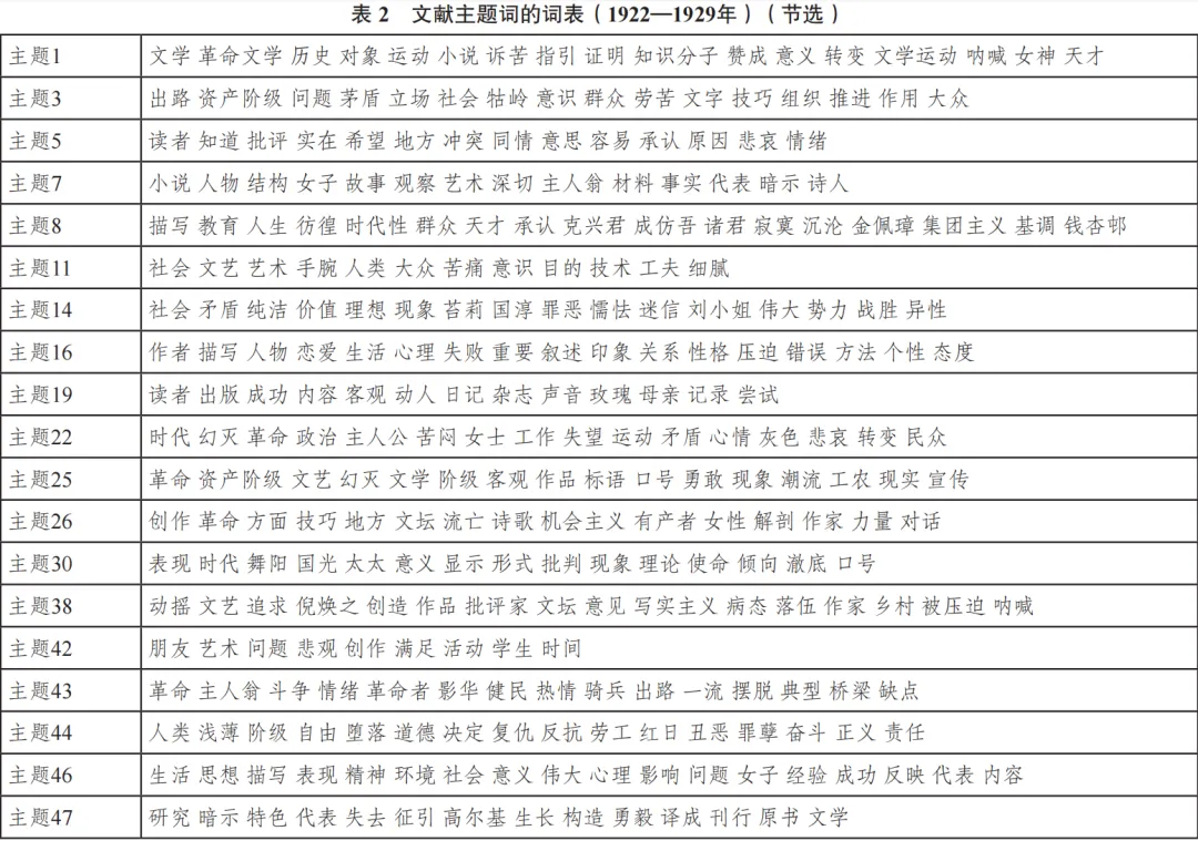 第二,立场重于艺术的左翼批评范式现出端倪并形成初步的政治批评场域。这一点凤凰彩票通过考察作者发文量统计中占据第一的钱杏邨及其他左翼批评家的批评文献可以得知。鉴于下文使用到钱杏邨与茅盾的批评文献主题词,也因篇幅所限,因此表2以他们两人的文献主题词为主,对完整的词表进行了节选。根据主题的概率分布从大到小排序,钱杏邨文献内容的前10个主题分布为:26、16、30、46、22、5、38、25、19、47,由之考察钱杏邨的批评话语的特征,并对表1中批评频次较高的作品的文献(重点是与政治话语相关的批评文献)进行考察,又与表2中与政治话语相关的主题词进行相关对照,可以看出,钱杏邨急于确认革命文学在文学史中的地位,在批评史中建构了左翼的立场重于艺术的批评话语范式。