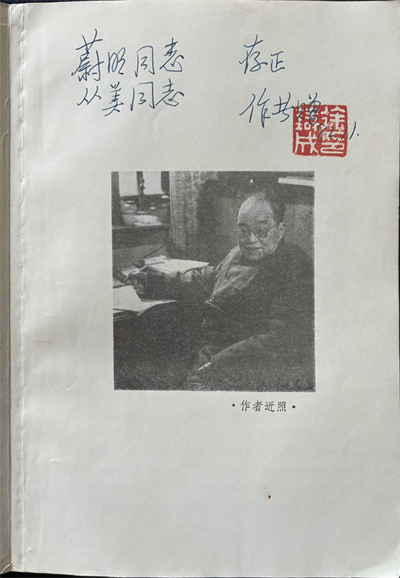 徐铸成是文汇报的创办人之一,1957年以后离开了《文汇报》,晚年曾来参加过《文汇报》的活动,依稀记得见过他的一个背影。手头这本徐铸成签赠给谢蔚明的《杜月笙正传》,浙江人民出版社,1982年6月第一版,是我几年前在旧书店淘到的。在“作者近照”的上方,徐铸成钢笔题写:“蔚明同志、从美同志存正。作者赠,82.11.”钤白文“徐铸成印”。