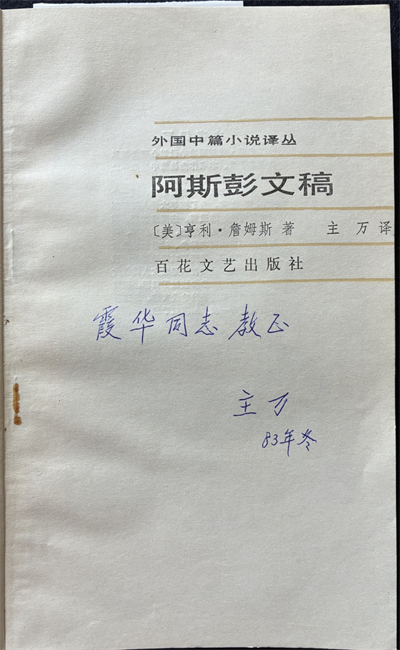 我买到的这本《阿斯彭文稿》,书名页有译者主万的题词:“霞华同志教正。主万,83年冬”。霞华应该就是译者曾经的同事、华东师范大学外文系教授杨霞华,钱谷融的太太。钱谷融先生是很熟悉的,以前好多文学活动都能见到他,慈眉善目、笑容可掬。而这位杨教授我无缘识荆。曾在吴俊的《追思我的导师钱谷融先生》一文中读到,他们师生俩有次谈到恋爱问题,钱先生对吴俊说:“我也有苦恼啊,杨先生有时发起脾气来,会过来揪着我的耳朵从这个房间拉到那个房间。”吴俊写道:“杨先生是我的师母,华东师大外语系的资深教授,年长先生四岁,师母任副教授时,先生还是小讲师。……我在先生家里,多次听到隔壁杨先生直呼先生的名字,而先生说起师母则总是杨先生三字。”(黄平主编《师大忆旧(华东师大卷)》,江苏凤凰文艺出版社,2022年1月版,73页)
