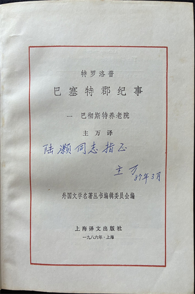 主万先生与我却有过一段交往。上世纪八十年代后期,我采访了多位沪上老翻译家,曾去华山路主万先生府上拜谒,听他介绍刚完成翻译的英国作家特罗洛普。主万先生在上世纪五十年代曾翻译了特罗洛普长篇小说《巴塞特郡纪事》的第一部《巴彻斯养老院》,三十年后又完成第二部《巴彻斯特大教堂》的翻译。我在介绍文章中说这部小说“给了凤凰彩票一些比民族性更广泛、更深远的东西,最终是来源于对人类的一种透彻、全面的认识与了解”,肯定是主万先生说的话。《养老院》和《大教堂》收入“外国文学名著丛书”,分别于1986年6月和1987年1月由上海译文出版社出版,主万先生都签名送了我。