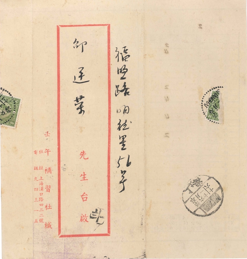 当然,这一成绩单上还有几处可注意之处:一者是邵贻裘在光华高中所上具体课程及成绩,他们分别是国文(2)、英文(4)、大代数(2)、复习数学(4)、物理(4)、西洋文化(2),从成绩单上的说明可知,学生的成绩等第对应的分数分别是1等:90至100,2等:80至89,3等:70至79,4等:60至69。同时,这一成绩单的外封上写有“福煦路明德里56号邵廷荣先生台启”字样,福煦路明德里56号无疑是邵贻裘的家庭住址,而邵廷荣当是邵贻裘的父亲。此外,这封成绩单寄出的时间为1942年6月,其外封上印有壬午补习社的地址是“汉口路422号”,此处的“汉口路422号”实为光华大学在抗战中另一处寄居之地——上海证券大楼。