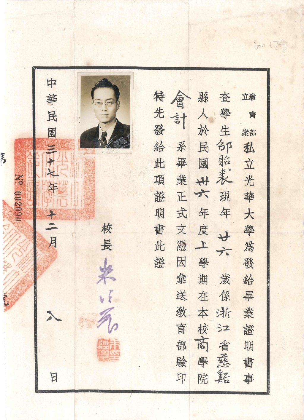光华大学1948年发给邵贻裘的《大学毕业证明》