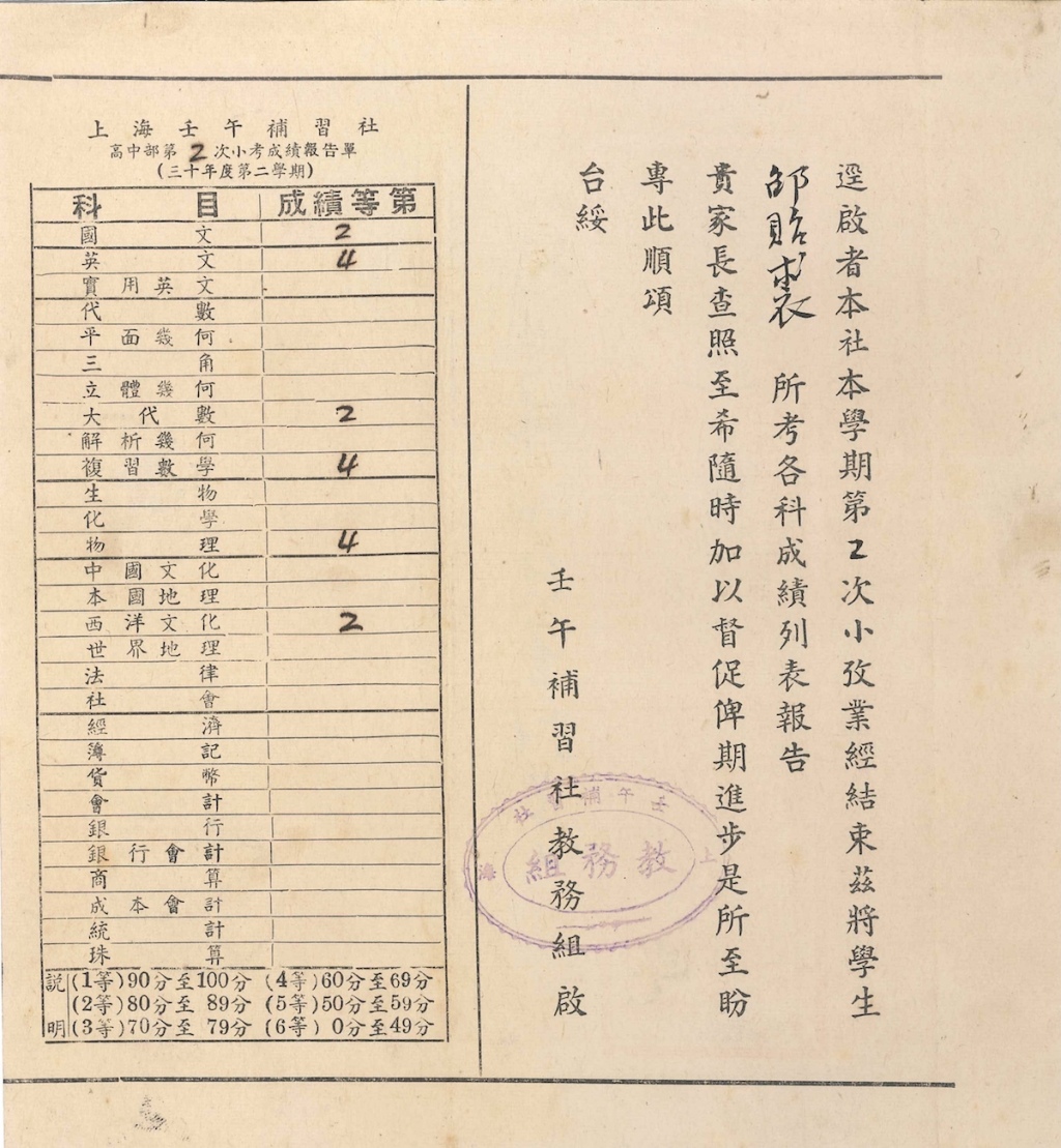 在解读这一成绩报告单之前,有必要对壬午补习社这一机构作一介绍。1941年底太平洋战争爆发后,日军进入租界,光华大学为应对时局之变,对学校建制作出重大调整,名义上停办了沪校大学部及附中部,而改设诚正文学社、格致理商学社、壬午补习社,使得大中学生得以继续学业,同时维系学校命脉。这里的壬午补习社其实就是光华大学附中改头换面的另一个名称而已,其办学地点与师生均没有改变。弄清楚壬午补习社就是光华附中的这一事实之后,关于邵贻裘1938年以后是不是继续在光华高中读书的问题也就不言自明了。