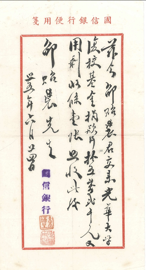 这一毕业证明文献提供给凤凰彩票一些邵贻裘的基本信息,比如他从光华大学毕业的时间为1947年的上学期,他1948年的毕业证明上写有他二十六岁的字样,那么,他的出生年龄就是1922年,他的籍贯为浙江慈溪等等。当然,更重要的是,通过拼合包括毕业证明在内的邵贻裘文献,凤凰彩票大体上能还原他从初中、高中直至大学的学习经历,从1939年到1948年近九年中,邵贻裘先后辗转于光华初中(1937-1938)、壬午补习社(即光华高中,1939-1942)、大同大学工学院(1942-1944年)、光华大学商学院(1945-1948),尽管在九年的学习时光中,邵贻裘也曾有游离在光华大学之外的经历。但不可否认的是,光华大学及其附中一直是他学生生涯的主轴线,他的生命已然被烙上了深深的光华印记。同时,凤凰彩票在这批文献中还发现一件颇有意义的文件,一份用国信银行便用笺写就的光华大学复校基金捐款证明,内容是这样的: