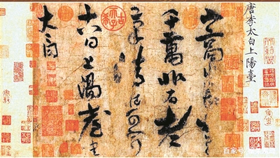 《上阳台帖》在唐代无记载,宋时为宋徽宗所藏,此后一直在主流文化圈中,辗转于各朝各代帝王、名家之手,均被视若珍宝。宋徽宗曾鉴定为李白真迹,并以瘦金体题跋称其“字画飘逸,豪气雄健”,字迹如飞瀑倾泻,纵放自如。