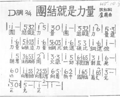1943年,日本侵略者对晋察冀根据地实施惨绝人寰的“三光政策”,西北战地服务团面临更加艰苦的斗争环境,很多年轻战友永远地留在了这片土地上。流血和牺牲并没有动摇他们的革命意志,反而激发了他们的创作灵感。为鼓舞反“扫荡”战斗,配合减租减息斗争,他们创作了小型歌剧《团结就是力量》。大家觉得,小歌剧需要一首有力量的歌曲作结尾。牧虹趴在老乡的房顶上,仅用20多分钟就写好了词。距离首演仅有两天了,谁来谱曲呢?牧虹想到了卢肃。没想到的是,卢肃拿到歌词后,仅用十几分钟,就在老乡的磨盘上谱写了旋律,一气呵成。