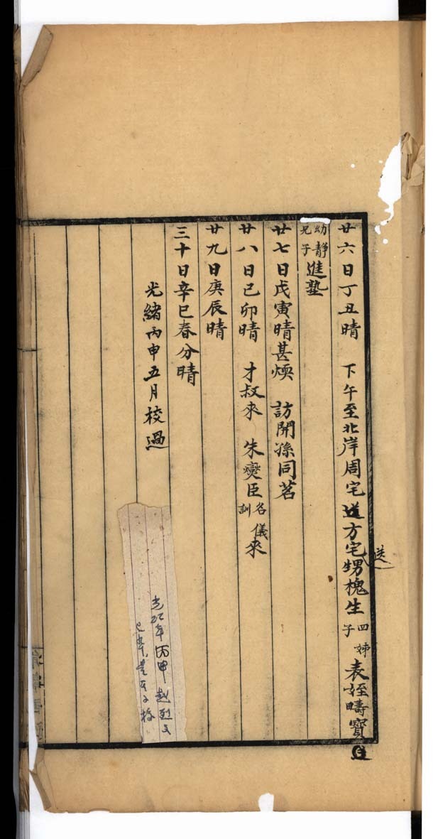 这个录副人,绝不是赵宽。因为从南图所藏的《落花春雨巢日记》一册及《能静居日记》五十四册中看,赵宽仅仅是校对者。先看《落花春雨巢日记》。赵宽依次批有“光绪丙申五月校过”(图2)“庚戌八月十二日校”“戊戌十月二十日校”“辛亥八月十六日校”,可知该日记,赵宽从光绪二十二年(1896)即开始校对,此时距赵烈文下世刚两年。再看《能静居日记》五十四册。第一册中缝有“甲辰十月校”、册末有“甲辰十月依原本校勘竟宽谨识”,这里的“原本”,可能是赵烈文的手稿本,也可能是前引《小脉望馆书目》中著录的前一种,“甲辰”为光绪三十年(1904),这一年赵宽开始校勘《能静居日记》,第五册中缝有“癸酉三月校”,到最后第五十四册末“癸酉十一月校毕”,可知赵宽中断了二十八年,直到民国二十二年(1933),才开始全力以赴,用八个月的时间校完了其父日记,此时距赵宽谢世已不满六年。