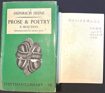 《海涅诗文选》(Prose & Poetry: A Selection)的前衬页上方钢笔题写:“给培信:廿九岁生日记念。世点,一九五七.二.北京。”