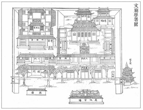 卫所建学的先例由来已久,早在洪武年间,便下诏各地卫所也一并设学:“洪武二年……天下府、州、县各立学校,军卫亦一并设学”,但直到洪武十四年,方才在辽东都司设立首所卫学——辽东卫学。之后截至宣德年间,卫学只是在东北和西北边疆地区零星设置,并未在全国范围内推广。故而在明朝初年,卫所军籍士人只能就学邻近府州县,位于今上海地区的金山卫也不例外,在此时甚至有几人入松江府学进而登科的案例。然而到了明朝中期,金山卫官兵生齿日繁,使得卫所里出现了庞大的无需服役的军余群体,其中佼佼者也大多投身科举、在科场上一搏功名。而累代长于卫所的军籍士人既无法返回原籍地参加科举,又不可能大规模挤占就近府州县的学额资源,卫籍士子入学成为亟待解决的问题。宣德末正统初年间,随着海内大定、人丁滋生,朝廷诏令全国,在卫所广设卫学:“国朝军卫无学。宣德十年,从兵部尚书徐河之请,令天下军卫独治一城者皆立学。正统以来,天下军卫延至边徼建学,设教授、训导,品秩俸禄如府学之制。”金山卫学便是在此政治背景下,于正统四年由巡抚御史周忱依例奏设:“卫初无学,正统已未,始令天下非丽(隶)郡县军卫立庙学,制与郡学同......教成而能登第者,以文阶官之,使有异才者,不局于武功一途。”正统十三年,提学刘福又在儒学西侧兴建文庙,奠定了卫学的主体建筑规模,之后历代学官对于卫学和文庙多有增筑修缮,但均未超出此范畴。