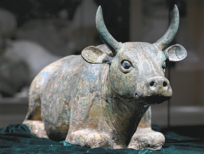 鎏金铜牛作为宁夏博物馆的“镇馆之宝”,代表了西夏时期铸造工艺的最高水平。铜牛1977年出土于银川西夏陵101号陪葬墓,通体鎏金,内部空心。造型独特,为跪卧姿势,双角弯曲,双耳外展,鼻子微微上翘,眼睛圆睁且向外凸,注视着远方,好像劳累一天的黄牛在跪卧休息时,突然听到远处主人的呼唤,抬头远望、目闪灵光。这件铜牛集塑形、铸造、鎏金、抛光等多种工艺于一身,达到了神形兼备的艺术效果。以铜牛为随葬品反映了西夏农耕经济的兴盛。