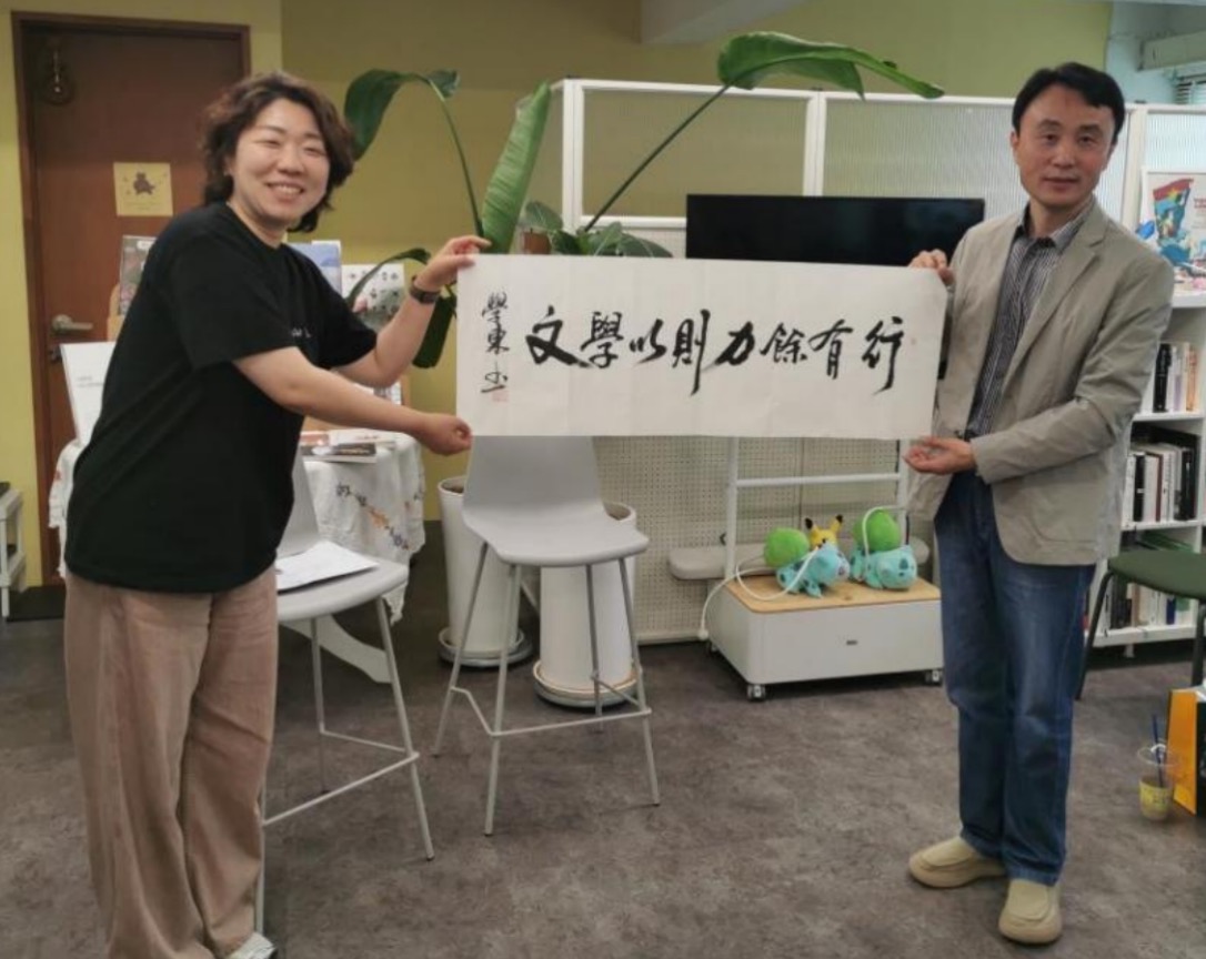 通过共读张学东的短篇小说《跟瓶子一起唱歌》的翻译稿,作家与读者展开了积极而深入的互动。读者们不仅分享了阅读感受,还就中国历史小说(特别是西北地区背景作品)的特点、方言如何展现地域特色及方言在翻译中的处理等专业问题,与作者进行了探讨,以期更深入地理解中国文学。分享会后,张学东还介绍了宁夏作家协会的组织性质和工作内容,特别是在当下文学发展中所发挥的桥梁作用。张学东向主办方和现场幸运读者赠送了自己的新书和书法作品,表达了对中韩文学交流的诚挚祝愿。