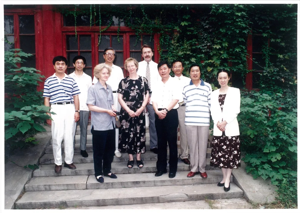 九十年代初,在文学馆旧址万寿寺与馆长舒乙(前排右三)、副馆长吴福辉(后排左三)、周明(右二),及馆员于润琦、刘屏(后排左一二)接待外国学者
