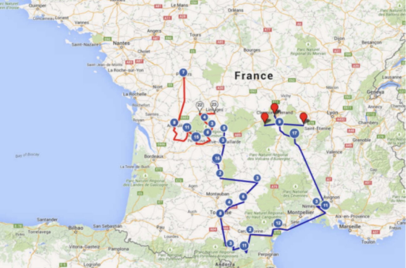 布列桑的地图追溯了庞德1912年徒步旅行的两个部分:第一个部分,从普瓦捷到利摩日,以红色路径和蓝色标记,发生在5月26日和6月7日/8日之间;第二个部分,从乌泽切到克莱蒙费朗,以蓝色路径和红色标记标示,时间是从6月27日持续到大约7月18日。