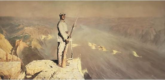 这种针对人物姿态的艺术修辞亦可见于《黄河颂》与《占领总统府》。《黄河颂》以八路军战士为主体,描绘了抗战期间八路军战士从容自信的姿态。背景中,凝结成线状的黄河奔流于峡谷,呼应了歌曲《黄河》的音乐性。《占领总统府》描绘渡江战役后解放军战士攻入南京总统府、升起红旗的场面。明暗法的使用强化了画面的叙事性。光影与姿态的结合,使人自然联想到浪漫主义画家欧仁·德拉克罗瓦作于19世纪的《自由引导人民》。二者同样凭借象征性的姿态与几何构图,激发起观者深刻的情感共鸣。