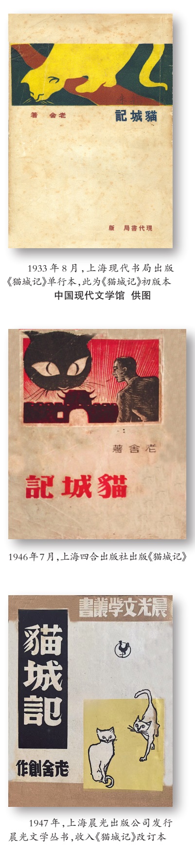 20世纪30年代初,面临社会动荡、战争阴云,中国文坛诞生了一批激愤哀怨、辛辣讥讽的社会讽喻小说。这其中就包括1932年老舍在《现代》杂志连载并于1933年出版的《猫城记》。这部小说以游记的形式讲述主人公遭遇空难后,流落火星,在“猫国”遭遇的一系列形形色色的见闻。